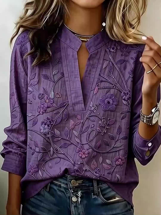 Ta elegancka, głęboko fioletowa koszula ma stójkę i kwiatowy wzór, dzięki czemu jest wygodna i uniwersalna.