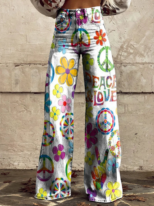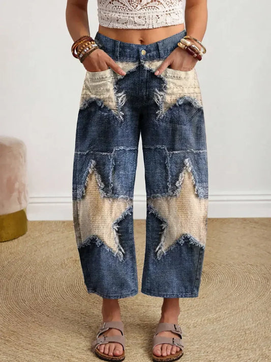 Te luźne jeansy damskie ozdobione są wzorem przedstawiającym dużą pięcioramienną gwiazdę, nadają się do noszenia na co dzień, mają kieszenie, średni stan i proste nogawki.