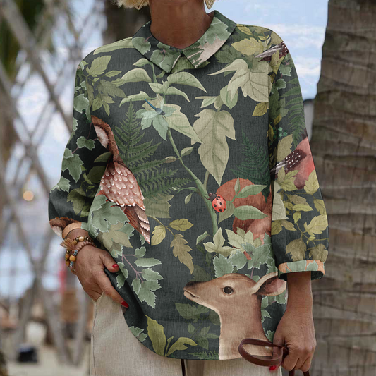 Elegancka i wygodna ciemnozielona koszula z długim rękawem, z kwiatowymi i zwierzęcymi nadrukami