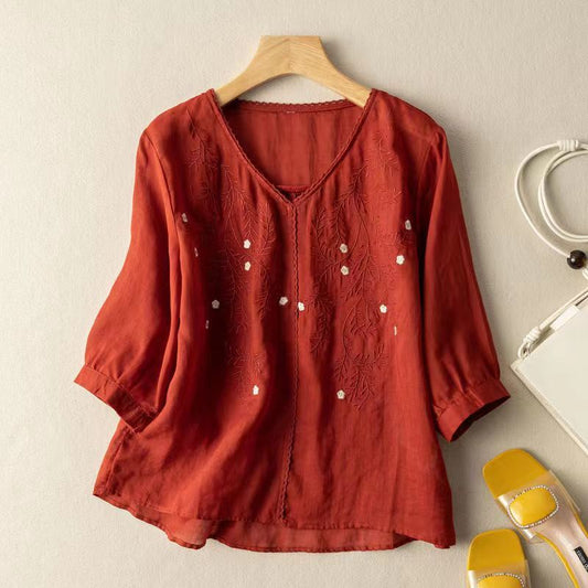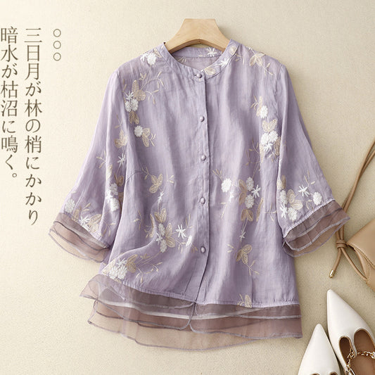 Elegancka koszula vintage z okrągłym dekoltem i haftowanymi kwiatami 02