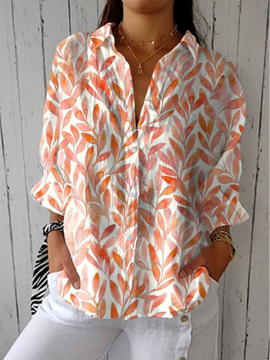 Piękna koszula z długim rękawem wykonana z bawełny i lnu, z wzorem pomarańczowych liści