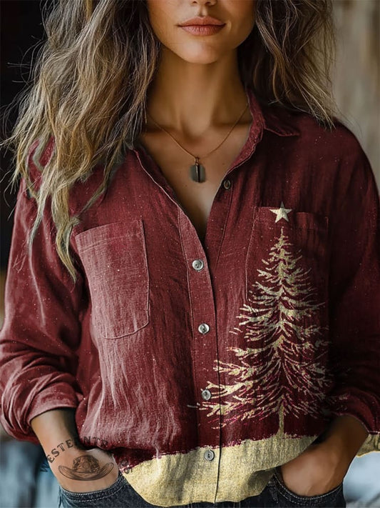 Koszula z długim rękawem z bawełny i lnu z motywem sosny