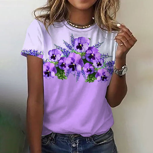 Damska koszulka swobodna z nadrukiem w fioletowe kwiaty