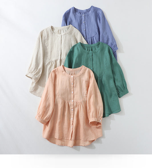 Luźna, lniana koszula z okrągłym dekoltem, damska koszula z rękawami typu lampion