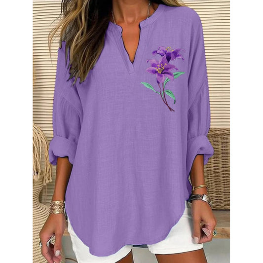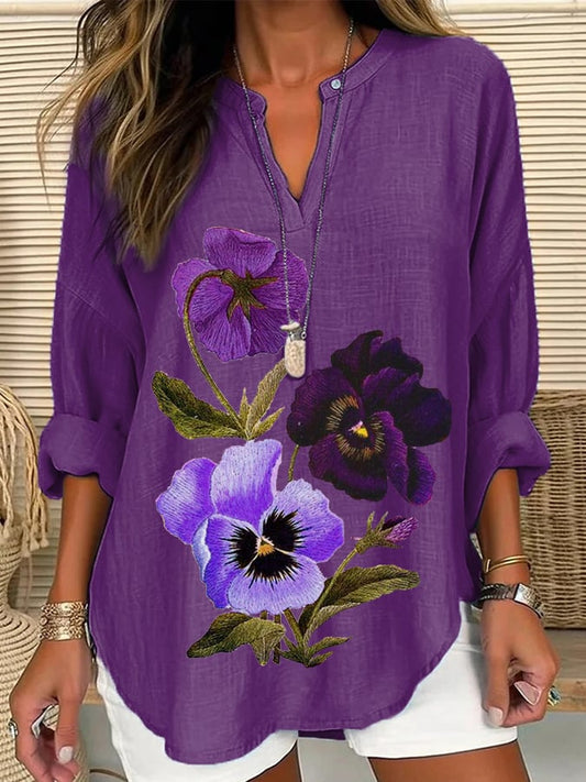 Fioletowa koszula z kwiatowym nadrukiem i dekoltem w kształcie litery V