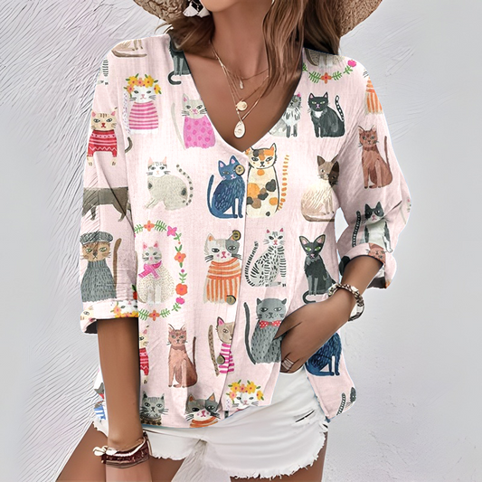 Elegancka i wygodna różowa koszula ze wzorem kota z kreskówkowej kreskówki, dekoltem w serek, rękawami 3/4 i zapięciem na guziki