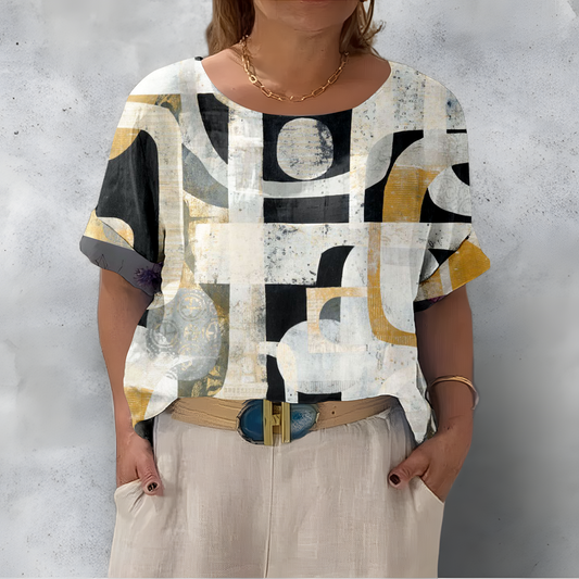 Luźna i wygodna koszula z krótkim rękawem i okrągłym dekoltem, ozdobiona abstrakcyjną grafiką