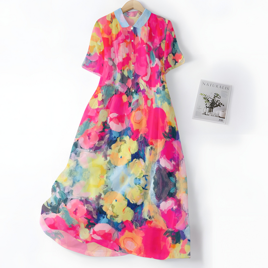 Elegancka i wygodna sukienka w żywych kolorach o nieregularnym wzorze, z kołnierzykiem koszulowym i guzikami