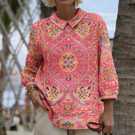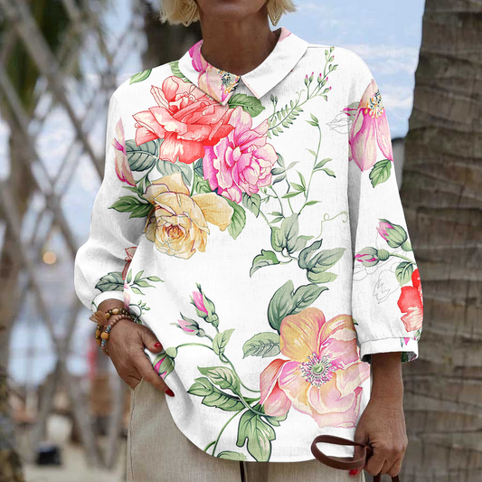 Elegancka koszula damska z bawełny i lnu w różowo-kwiatowy wzór, zapinana na guziki przy szyi