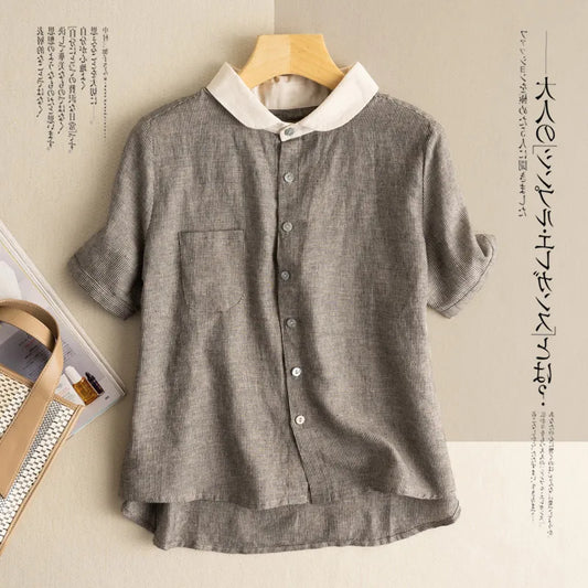 Elegancka i wygodna koszula w paski retro z bawełny i lnu z krótkim rękawem i kołnierzykiem typu laleczka
