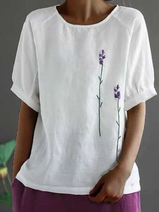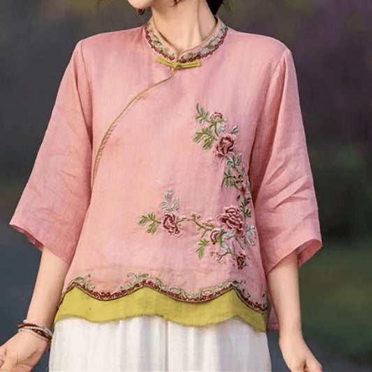 Koszula damska z rękawem trzy czwarte, kontrastowymi panelami i haftowanym wzorem kwiatowym