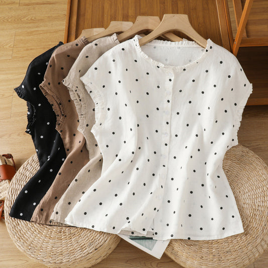 Koszula damska w groszki z krótkim rękawem i okrągłym dekoltem, materiał bawełna i len
