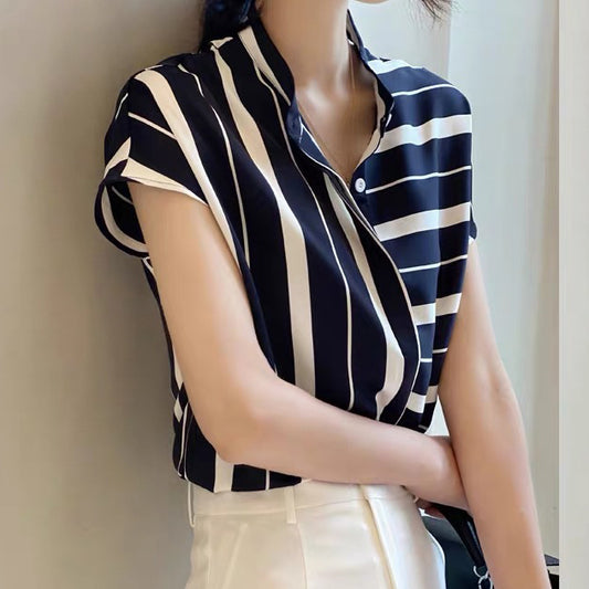 Koszula damska z krótkim rękawem i stójką w paski, dopasowana, wykonana z gładkiej bawełny i lnu