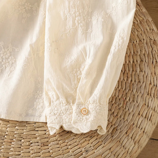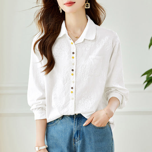 Damska, słodka i uniwersalna, biała koszula z długim rękawem, zapinana na guziki, z haftowanym wzorem i stójką