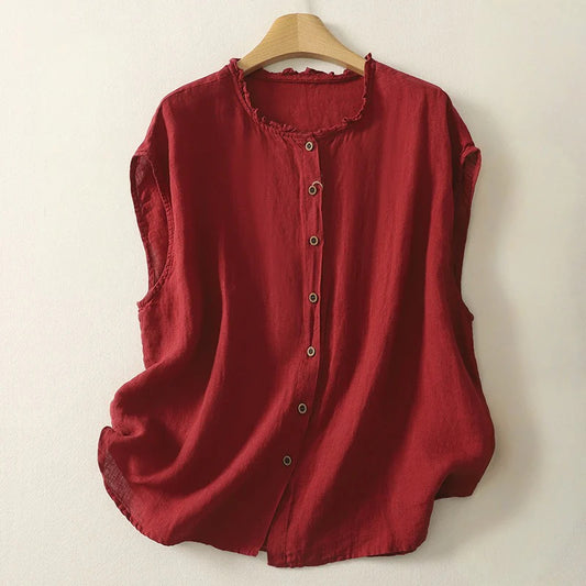 Koszula damska bez rękawów, zapinana na guziki, wykonana z bawełny i lnu