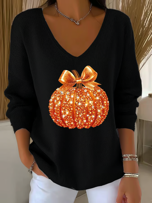 Elegancka i wygodna koszula z długim rękawem i dekoltem w serek, ze świątecznym wzorem dyni