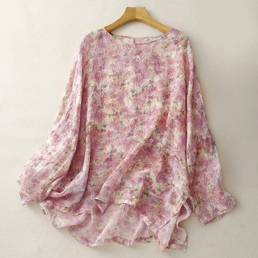 Elegancka i wygodna różowa koszula z nadrukiem kwiatowym i długim rękawem, okrągłym dekoltem