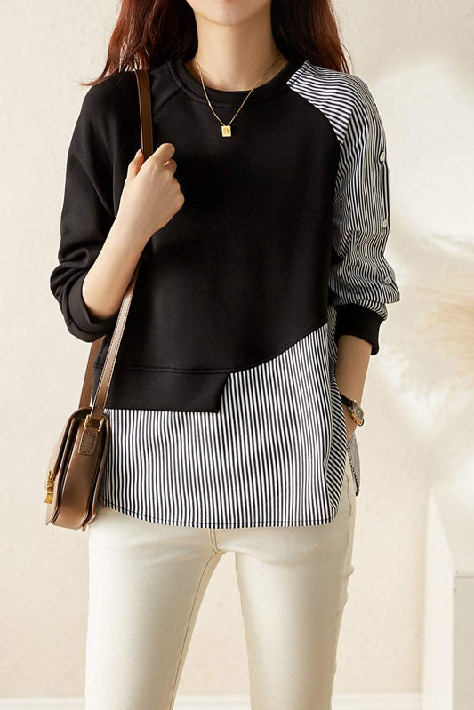 Ta wygodna, asymetryczna koszula w paski ma imitację dwuczęściowej konstrukcji.