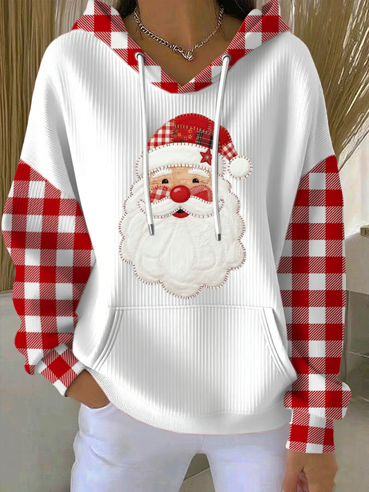Klasyczna i wygodna bluza z kapturem w czerwono-białą kratkę, ozdobiona grafiką Świętego Mikołaja i przednimi kieszeniami