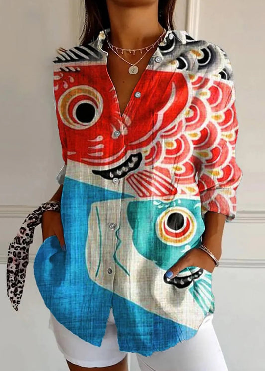Casualowa koszula z dekoltem w szpic i nadrukiem w stylu retro z motywem kwiatowym