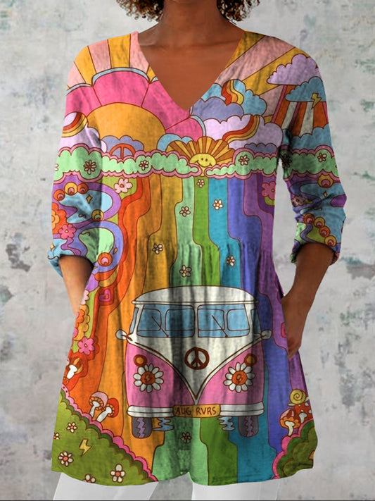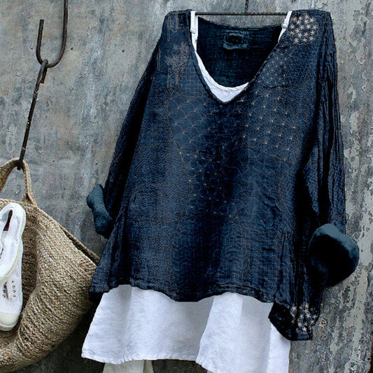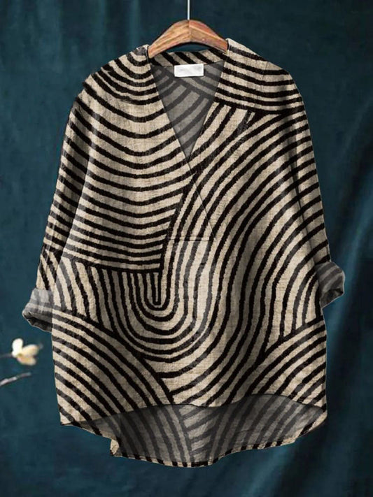 Damski nadruk graficzny w okrągłą linię, swobodna bawełniana i lniana koszula z dekoltem w kształcie litery V