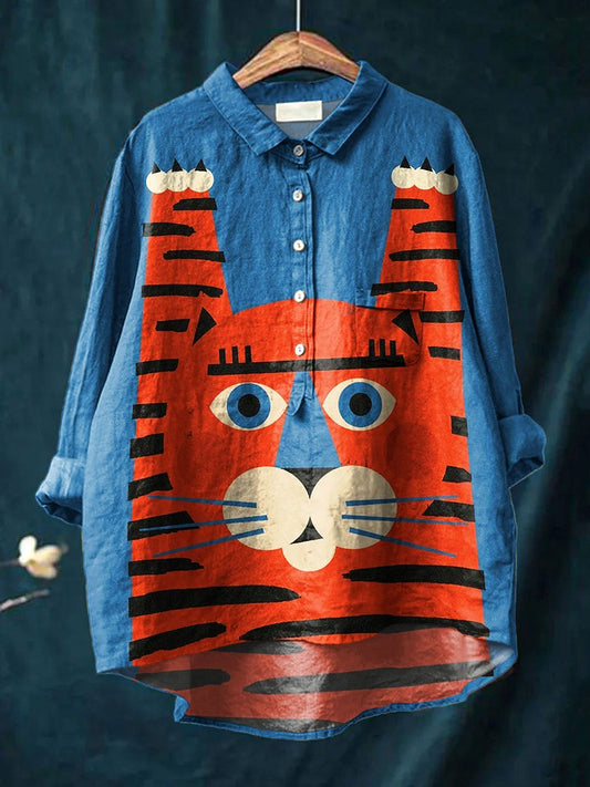 Damska koszula w stylu vintage z nadrukiem tygrysa, na co dzień, bawełniana i lniana
