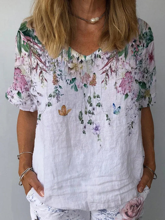 Damski drapowany T-shirt z bawełny i lnu w kwiatowy wzór