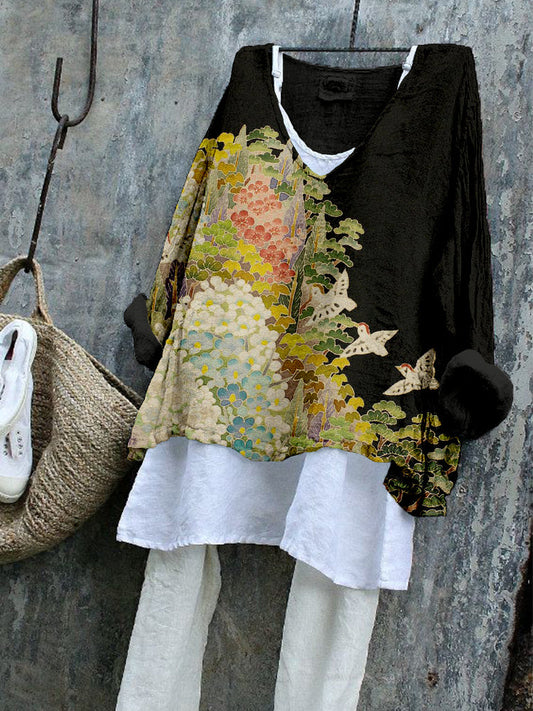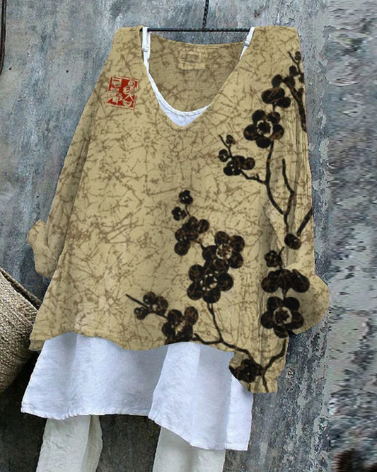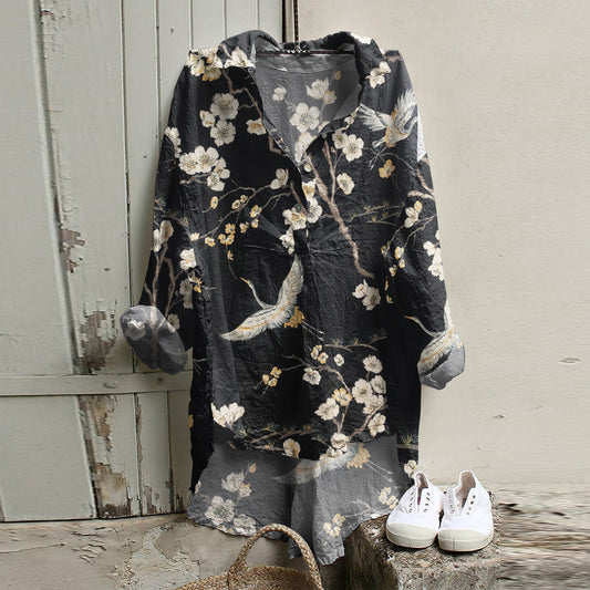 Żuraw Śliwkowy kwiat Morska sztuka japońska Bawełniana i lniana koszula z luźnymi klapami ciemnoniebieski