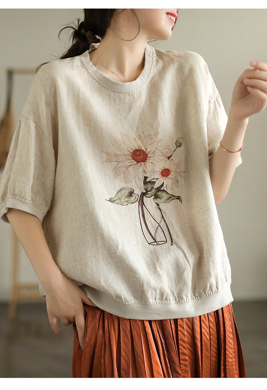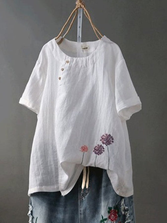 Damska haftowana bawełniana bluzka z krótkim rękawem i dekoltem w kształcie litery O