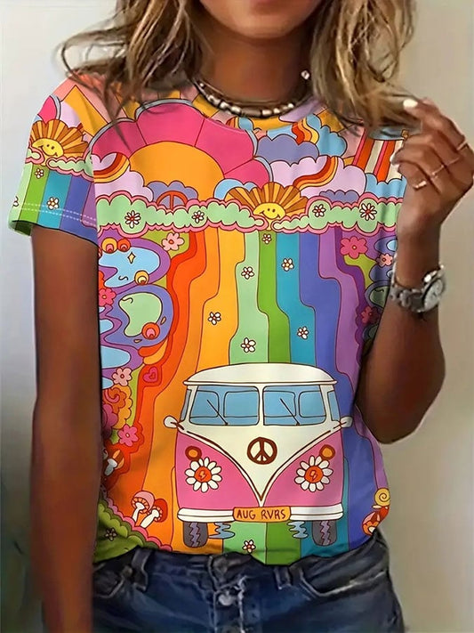 Damska koszula z krótkim rękawem i nadrukiem w stylu retro F