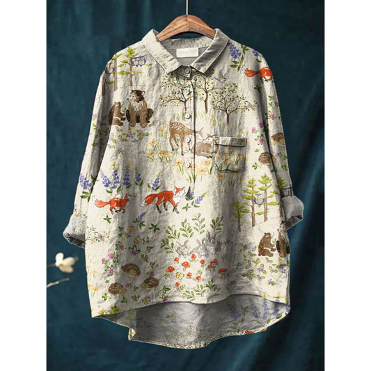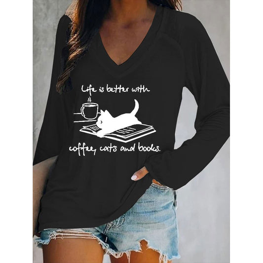 Damska koszula z długim rękawem i dekoltem w kształcie litery V z nadrukiem kota i książki