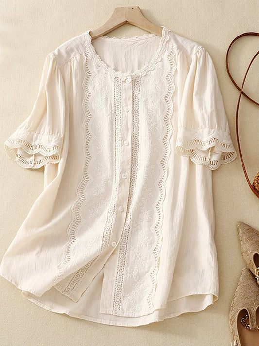 Koszula z krótkim rękawem i jednolitym kolorem, z haftem i koronką