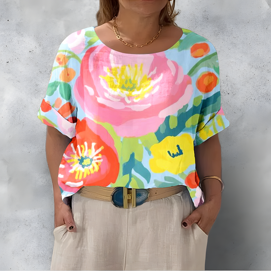 Luźna i wygodna koszula z krótkim rękawem i okrągłym dekoltem, ozdobiona dużym, kolorowym wzorem kwiatowym
