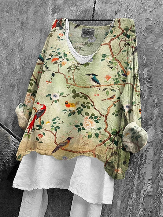 Damska luźna koszula z dekoltem w serek z nadrukiem japońskich kwiatów i ptaków