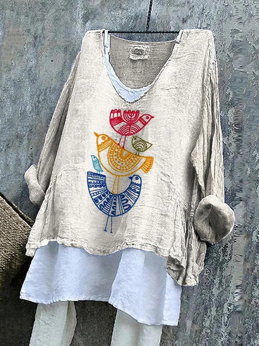 Koszula damska z lnu w stylu vintage z haftem ptaków i dekoltem w serek