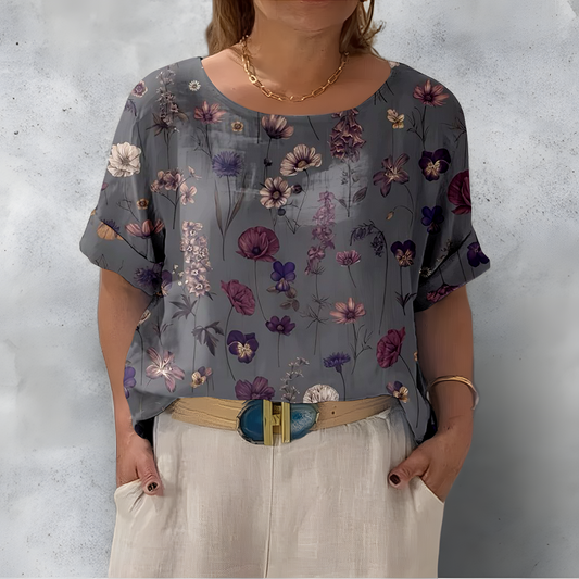 Luźna i wygodna szara koszula z krótkim rękawem i okrągłym dekoltem, ze wzorem kwiatowym