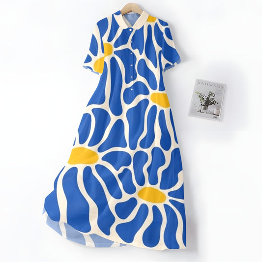 Elegancka i wygodna sukienka w kolorze niebieskim z kwiatowym wzorem, kołnierzykiem koszulowym i guzikami