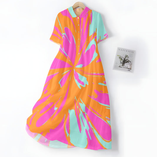 Elegancka i wygodna sukienka w żywych kolorach o nieregularnym wzorze, z kołnierzykiem koszulowym i guzikami