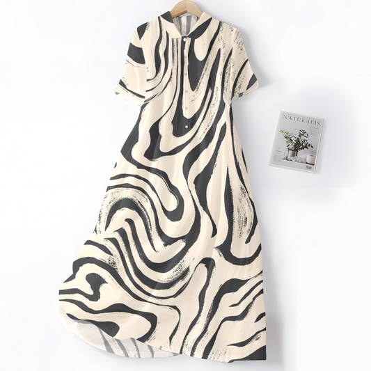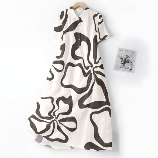 Elegancka i wygodna biała sukienka z czarnym, nieregularnym wzorem w kształcie krzywizny, kołnierzykiem koszulowym i guzikami