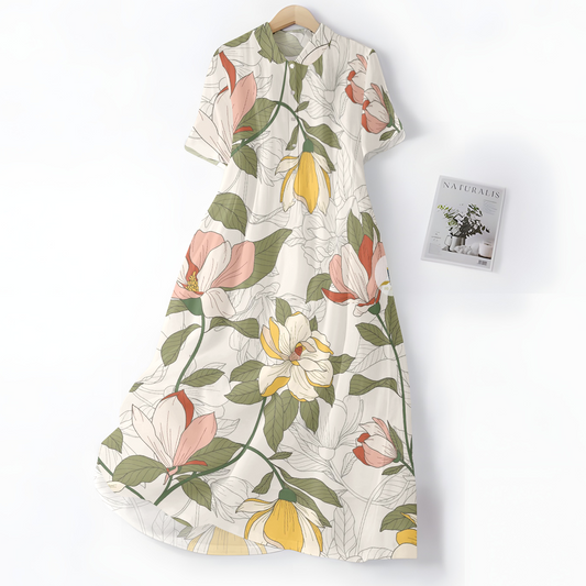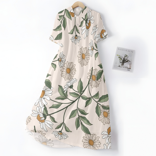 Elegancka i wygodna jasnobeżowa sukienka z pięknym wzorem stokrotek, kołnierzykiem koszulowym i guzikami