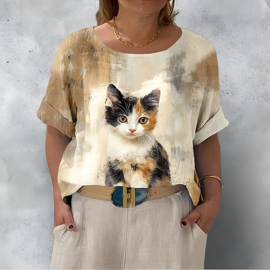 Luźna i wygodna brązowa koszula z okrągłym dekoltem i grafiką kota