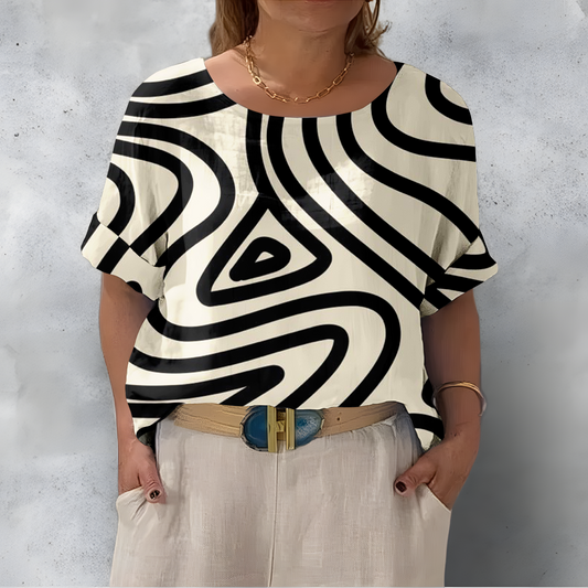 Luźna i wygodna biała koszula z okrągłym dekoltem i czarnymi, nieregularnymi krągłościami