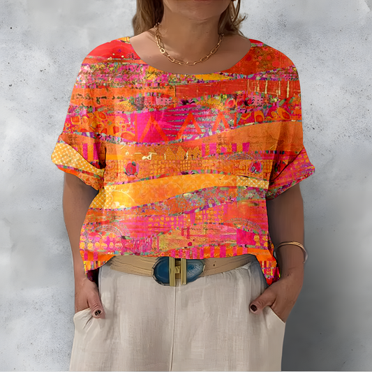Luźna i wygodna pomarańczowa koszula z krótkim rękawem i okrągłym dekoltem