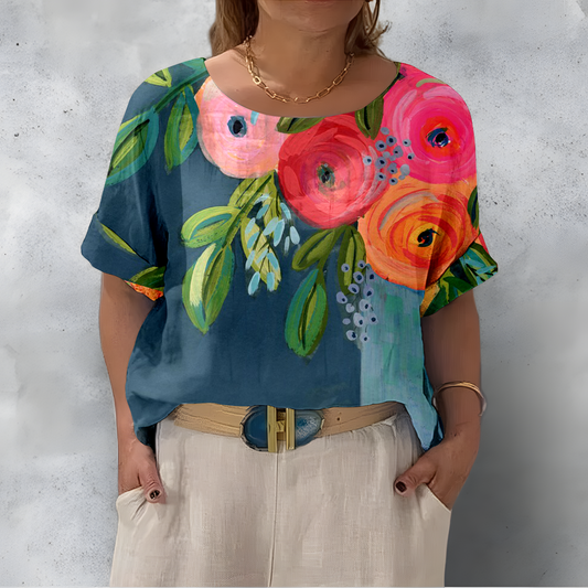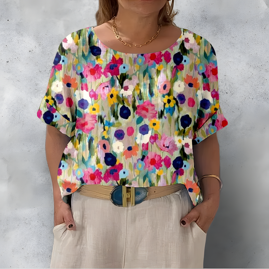 Luźna i wygodna koszula z krótkim rękawem i okrągłym dekoltem w kolorowy kwiatowy wzór