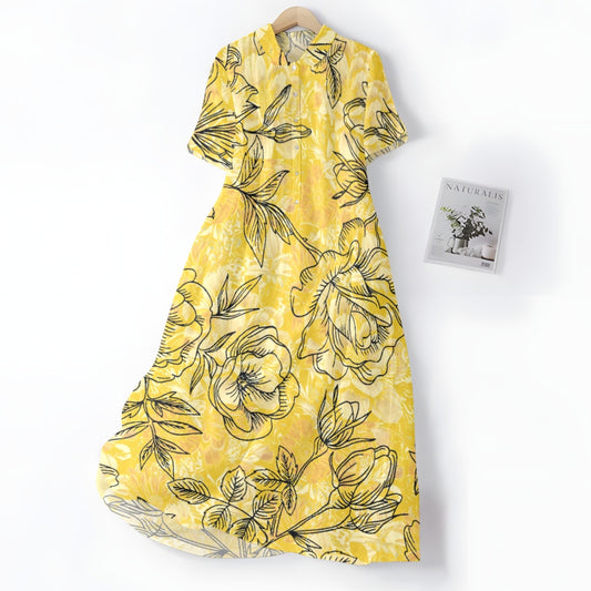 Elegancka i wygodna żółta sukienka z nadrukiem w kwiaty róży, kołnierzykiem koszulowym i guzikami