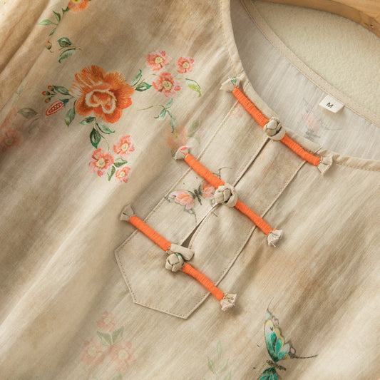 Elegancka i wygodna jasnobeżowa sukienka z kolorowym wzorem kapokowym, kołnierzykiem koszulowym i guzikami