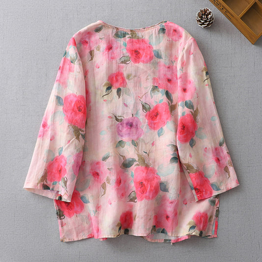 Elegancka koszula damska z bawełny i lnu w różowo-kwiatowy wzór, zapinana na guziki przy szyi