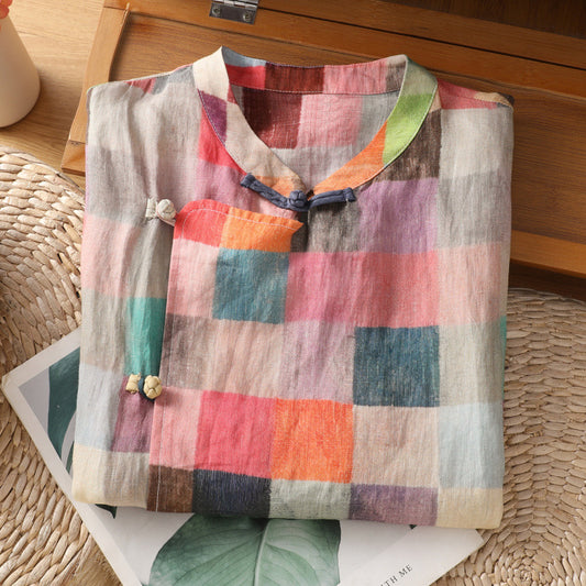 Elegancka i wygodna kolorowa koszula w kratę ze stójką i krótkimi rękawami zapinanymi na guziki