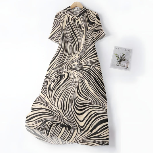 Elegancka i wygodna czarno-biała sukienka w nieregularne paski z kołnierzykiem koszulowym i guzikami