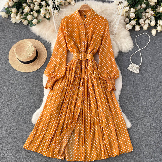 Elegancka i wygodna wielokolorowa sukienka w groszki z kołnierzykiem koszulowym i paskiem